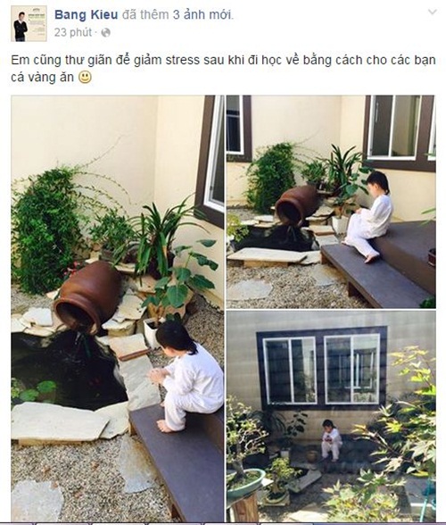 | Bằng Kiều khoe hình ảnh con trai út ngồi thư giãn: "Em cũng thư giãn để giảm stress sau khi đi học về bằng cách cho các bạn cá vàng ăn." Ảnh: FBNV |