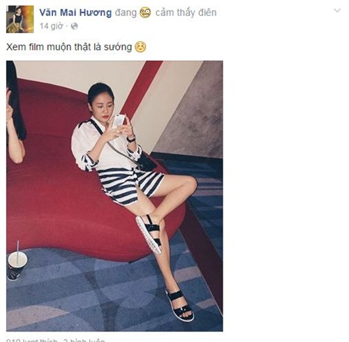 | Văn Mai Hương vô tư với dáng ngồi bá đạo sau khi xem phim muộn. Ảnh: FBNV |