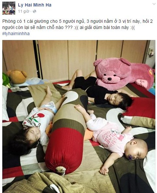 Bà xã ca sĩ Lý Hải chụp lại tư thế nằm ngủ hài hước của ba con: "Phòng có một cái giường cho 5 người ngủ, 3 người nằm ở 3 vị trí này, hỏi 2 người còn lại sẽ nằm chỗ nào?". Ảnh: FBNV |