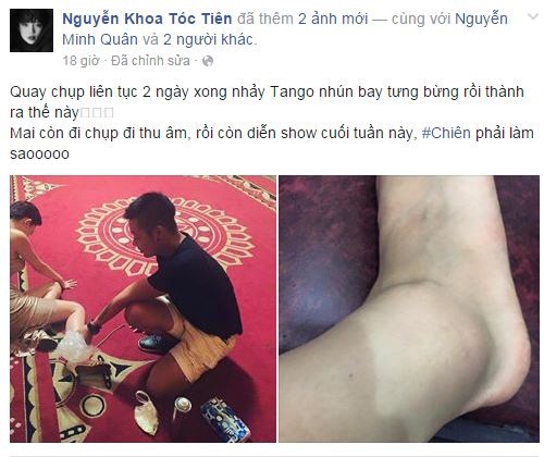 | Tập nhảy quá hăng say nên Tóc Tiên vô tình bị ngã quỵ, trật khớp. Fan rất lo lắng không biết nữ ca sĩ sẽ hoàn thành những show diễn sắp tới thế nào. Ảnh: FBNV |