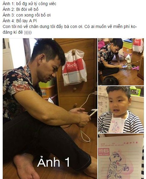 | Nghệ sĩ Xuân Bắc khiến nhiều người bật cười khi chia sẻ câu chuyện của hai bố con: "Bố đang xử lý công việc, Bi đòi vẽ bố... - Con xong rồi bố ơi. - Bố lạy A Pì. Con tôi nó vẽ chân dung tôi đấy bà con ơi. Có ai muốn vẽ miễn phí không, đăng kí đê". Ảnh: FBNV |