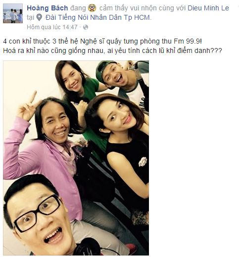 | Hoàng Bách vui vẻ chia sẻ: "4 con khỉ thuộc 3 thế hệ nghệ sĩ quậy tưng phòng thu Fm 99.9! Hóa ra khỉ nào cũng giống nhau, ai yêu tính cách lũ khỉ điểm danh?" |