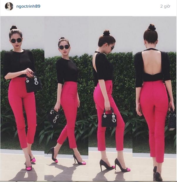 | Ngọc Trinh diện trang phục cá tính với hai màu chủ đạo đỏ và đen xuống phố. |