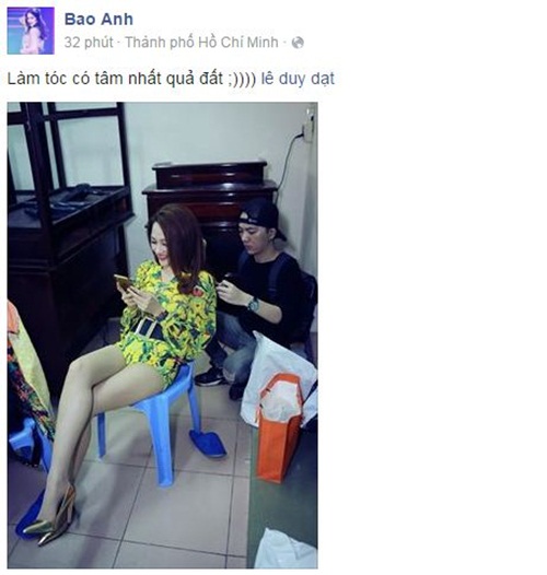 | Bảo Anh tranh thủ nghịch điện thoại trong lúc ngồi làm tóc. Ảnh: FBNV |