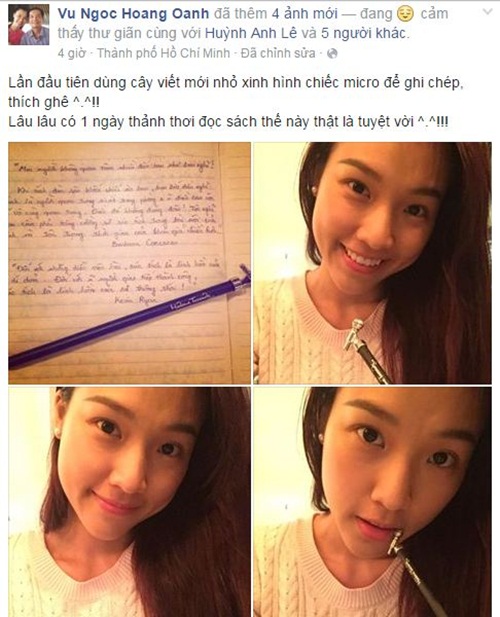 | Hoàng Oanh ngồi ghi chép lại những chú thích cho bản thân sau một ngày thảnh thơi đọc sách. Ảnh: FBNV |
