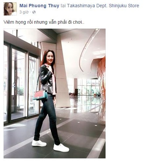 | Mai Phương Thúy dù bị ốm nhưng vẫn đi chơi. Ảnh: FBNV |