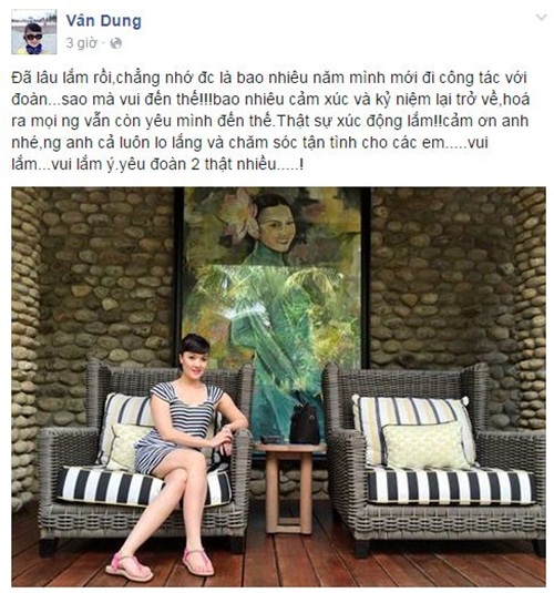 | Vân Dung: "Đã lâu lắm rồi, chẳng nhớ được là bao nhiêu năm mình mới đi công tác với đoàn...sao mà vui đến thế!!! bao nhiêu cảm xúc và kỷ niệm lại trở về, hoá ra mọi người vẫn còn yêu mình đến thế. Thật sự xúc động lắm!! Cảm ơn anh nhé, người anh cả luôn lo lắng và chăm sóc tận tình cho các em.....vui lắm...vui lắm ý. Yêu đoàn 2 thật nhiều....." Ảnh: FBNV |