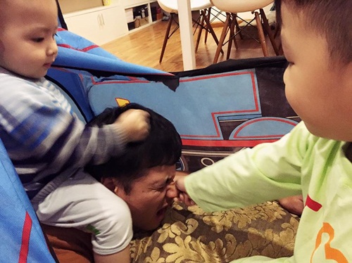 Diễn viên Đan Lê ghi lại hình ảnh "một buổi tối kinh hoàng" của ông xã Khải Anh khi bị con trai cả véo mũi, còn cậu út "đè đầu cưỡi cổ". Ảnh: FBNV |