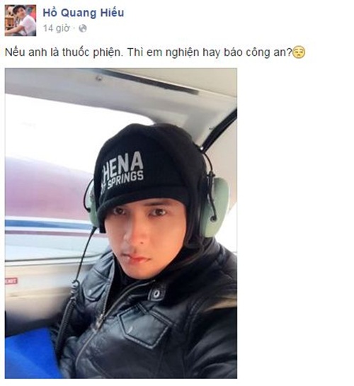 | Hồ Quang Hiếu: "Nếu anh là thuốc phiện. Thì em nghiện hay báo công an?". Ảnh: FBNV |