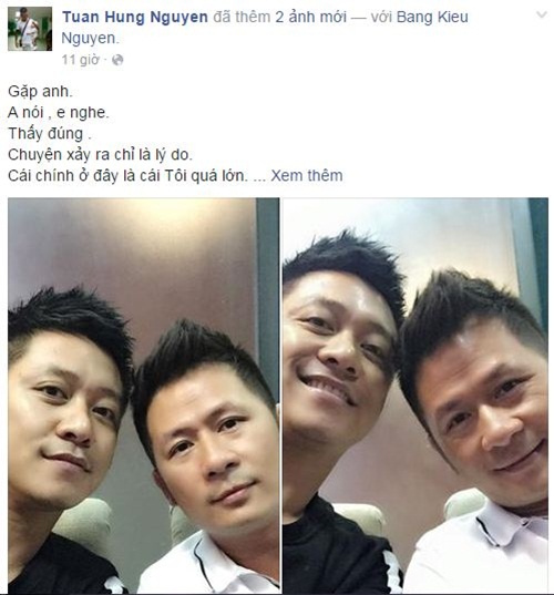 | Tuấn Hưng vui vẻ hội ngộ với Bằng Kiều. Anh cũng chia sẻ về những cảm nhận của mình trong lần gặp gỡ này: "Gặp anh. Anh nói, em nghe. Thấy đúng. Chuyện xảy ra chỉ là lý do. Cái chính ở đây là cái tôi quá lớn. Ai cũng có ý tưởng và mong muốn cho tương lai của mình. Và khi không vượt qua được cái tôi mà lý do cứ càng ngày càng nhiều thì... Vậy điều phải nghĩ chính là: đang muốn gì?". Ảnh: FBNV |