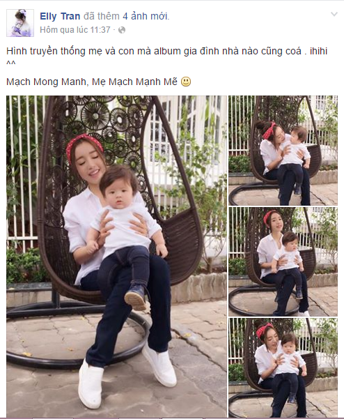 | Elly Trần chụp ảnh cùng cậu bé Túc Mạch và đùa: "Mạch Mong Manh, Mẹ Mạch Mạnh Mẽ" |