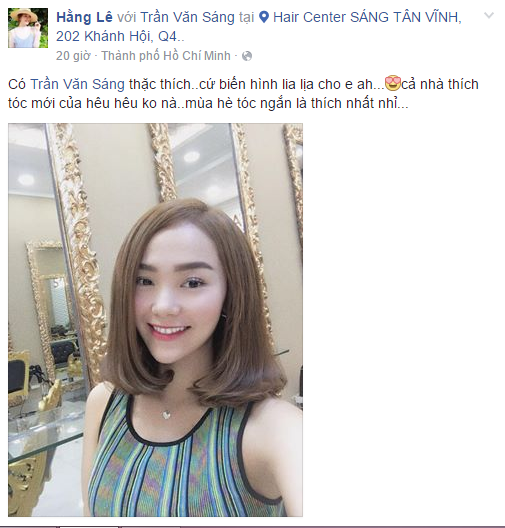 | Minh Hằng hí hửng khoe kiểu tóc mới toanh vừa làm. Tóc ngắn ngang vai, ôm cụp vào gương mặt giúp nữ ca sĩ rất trẻ trung. |