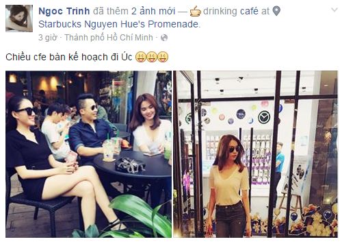 | Ngọc Trinh ngồi cà phê với bạn bè tại trời tây. |
