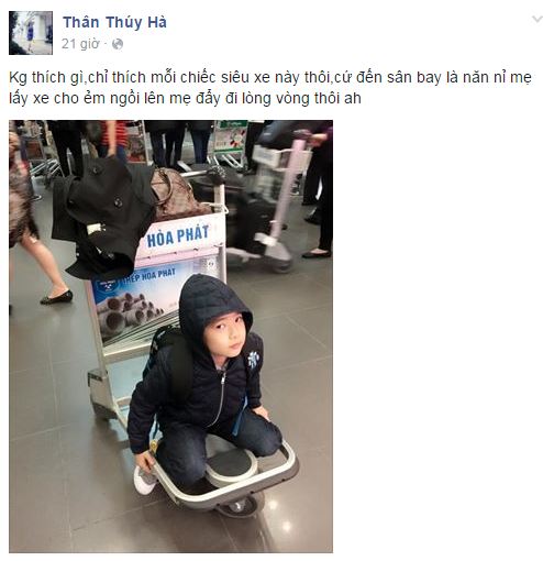 | Thân Thúy Hà chú thích hình ảnh con trai: "Không thích gì, chỉ thích mỗi chiếc siêu xe này thôi, cứ đến sân bay là năn nỉ mẹ lấy xe cho em ngồi lên mẹ đẩy đi lòng vòng thôi à". |
