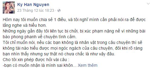 Kỳ Hân chia sẻ trên trang cá nhân: "Hôm nay tôi muốn chia sẻ 1 điều, và tôi nghĩ mình cần phải nói ra để được lắng nghe và hiểu hơn. Những ngày gần đây tôi liên tục bị chửi, bị xúc phạm nặng nề vì tin đồn phong phanh về chuyện tình cảm.