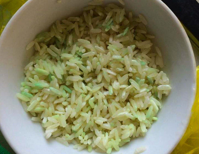 Gạo sau khi ngâm vào nước có hiện tượng đổi thành màu xanh và bốc mùi hôi thối. Ảnh: Tuổi Trẻ |