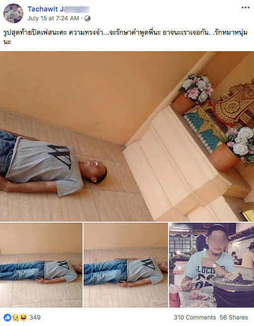 Những ngày vừa qua, Cộng đồng mạng đã rất phẫn nộ trước một hành động được cho là không thể tha thứ của một thanh niên Thái Lan. Tachawit J là người đã giả chết và bảo vợ của mình đăng ảnh lên trên Facebook với lời chú thích “Bức ảnh cuối cùng trước khi vô hiệu hóa tài khoản, yêu mọi người”.