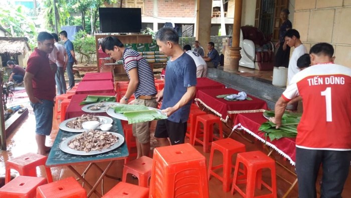 Ngay từ sớm, anh em bạn bè và người dân tại địa phương đã tụ tập tại nhà ông Nguyệt để phụ giúp gia đình làm thịt trâu, dựng rạp.