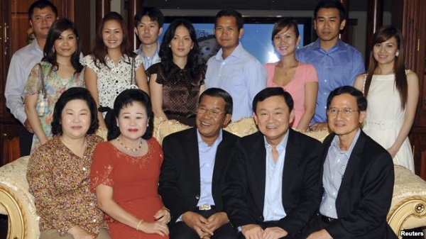 Gia đình ông Hun Sen chụp với hai cựu Thủ tướng Thái Lan Thaksin Shinawatra (thứ hai từ phải sang, hàng phía trước) và Somchai Wongsawat (đầu tiên bên phải, hàng phía trước). |