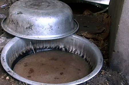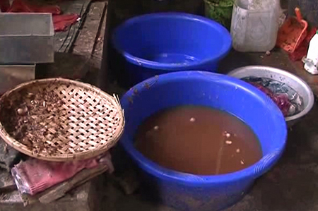| Nguyên liệu hành phi được đựng trong những xô, chậu cáu bẩn. Ảnh: Dân Trí |