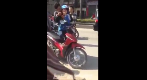 Cường ngồi sau khống chế cô gái bằng dao - Ảnh: Zing.vn |