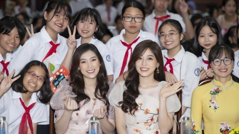 Trước vòng vây của các bạn học sinh, phải khó khăn lắm hai người đẹp Phương Nga, Phí Thùy Linh mới có thể vượt qua.