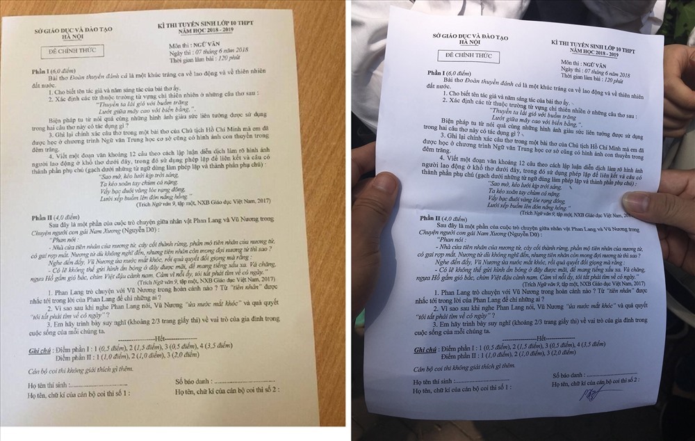 | Đề thi Ngữ văn lan truyền trên mạng (trái ảnh) và đề thi chính thức giống hệt nhau. Ảnh internet |