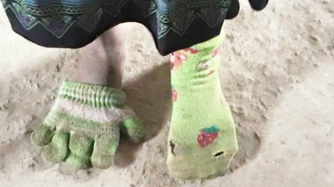 Ảnh bé gái chân đi găng tay, chân đi tất rách gây xúc động