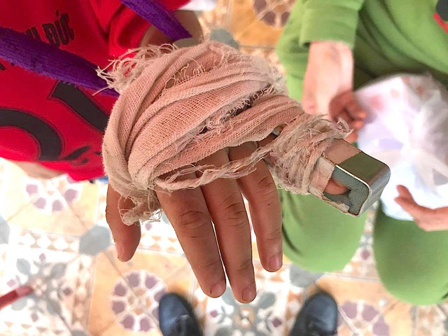 | Bàn tay cháu Long được nẹp sau khi chụp X quang phát hiện gãy đốt ngón tay.Ảnh Dân Trí |