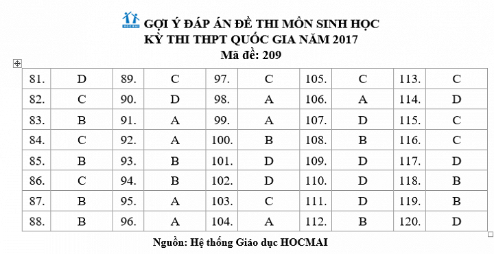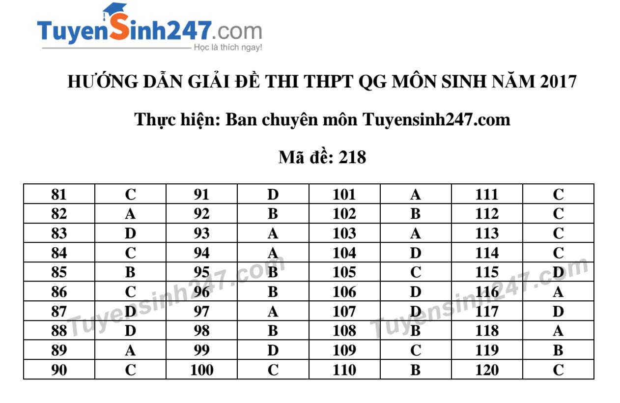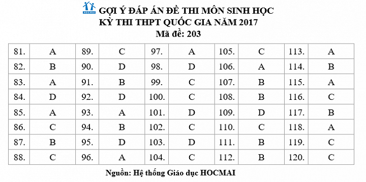 Gợi ý đáp án đề thi Khoa học tự nhiên môn Sinh học THPT quốc gia 2017 các mã đề.