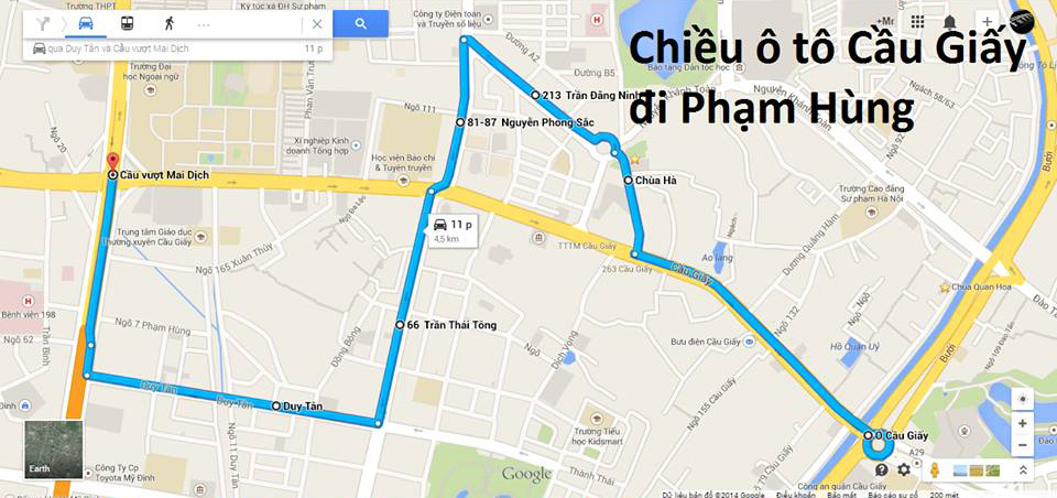 Xe ô tô con muốn đi từ Cầu Giấy - Phạm Hùng đi theo hướng Cầu Giấy - Chùa Hà - Trần Đăng Ninh - Nguyễn Phong Sắc - Trần Thái Tông - Duy Tân - Tôn Thất Thuyết - Phạm Hùng.