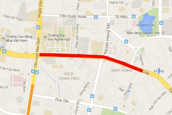 Xe ô tô muốn đi từ Mai Dịch- Cầu Giấy sẽ đi theo hướng Phạm Văn Đồng- Phạm Hùng- Duy Tân - Trần Thái Tông - Nguyễn Phong Sắc - Trần Đăng Ninh - Nguyễn Khánh Toàn - đê Bưởi.