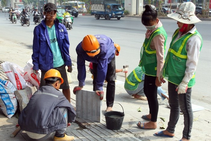 | Quận Thanh Xuân đang cho công nhân vá lại vỉa hè. Ảnh: Lao Động |