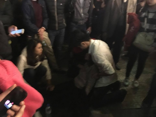 | Một cô gái trẻ ngất xỉu được cảnh sát đưa đi cấp cứu. Ảnh: CTV |