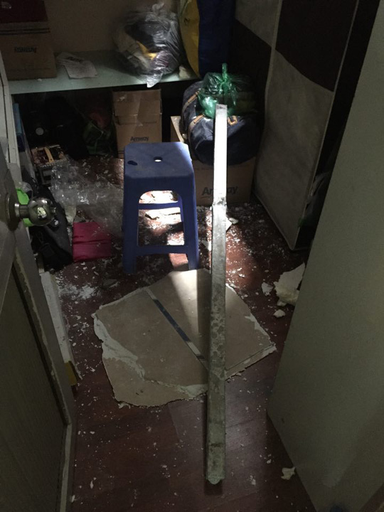 | Thanh thứ 2 rơi xuống sàn nhà tầng 2 của ông Trung. Ảnh: Người lao động |