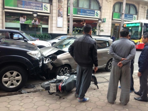 | Chiếc Kia Morning đâm liên tiếp 1 xe máy, 1 ô tô trên phố Lê Đại Hành |