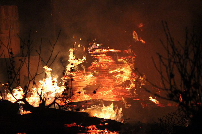 | Mất điện, lực lượng chức năng dập lửa tỏng bóng tối, người dân tụ tập phía ngoài để theo dõi |