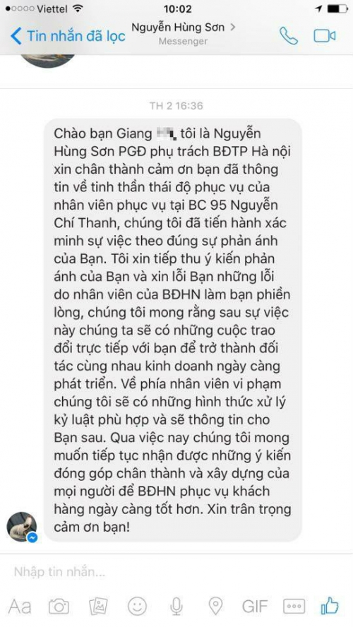Chia sẻ trên báo Người đưa tin, vào ngày 18/4 G.H cho hay có người tự xưng là nhân viên bưu cục 95 Nguyễn Chí Thanh và sau là lãnh đạo chánh văn phòng bưu điện đã gọi điện thoại cho cô: “Anh PGĐ bưu điện Hà Nội thì gọi điện xin mình gỡ bài viết và cũng viết status trên facebook là bên bưu điện đã làm rõ nội dung sự việc và xin lỗi đến mọi người. Nhưng quan điểm của em là không gỡ, nếu đã sai thì sửa".