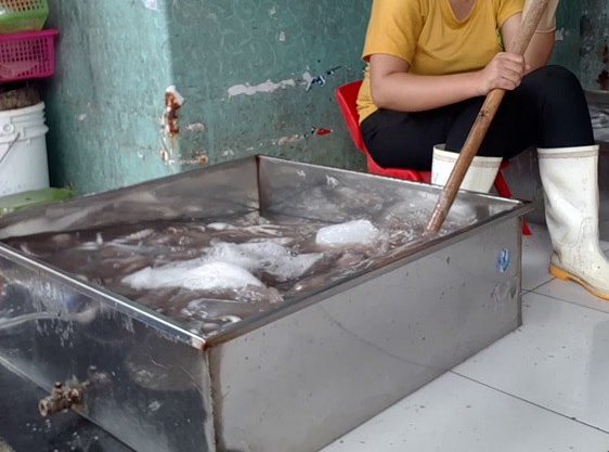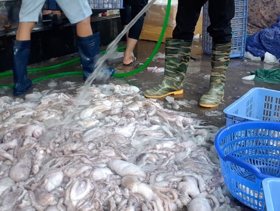 Bạch tuộc, mực được đổ vào khay chứa hóa chất để ngâm trong vòng 30 phút. (Ảnh: Bảo Việt) |