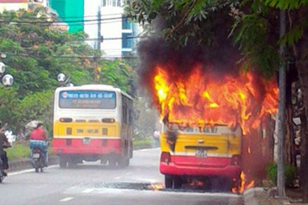 Tại hiện trường, chiếc xe bus bị lửa cháy trơ khung. Được biết, thời điểm đó trên xe có gần 20 hành khách.