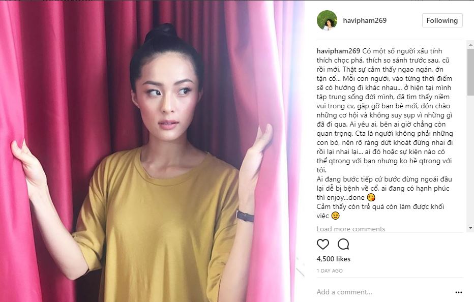 Mới đây, Hạ Vi bức xúc đăng tải status trên trang Instagram cá nhân về việc này: "Có một số người xấu tính thích chọc phá, thích so sánh trước sau, cũ rồi mới. Thật sự cảm thấy ngao ngán, ớn tận cổ… Mỗi con người, vào từng thời điểm sẽ có hướng đi khác nhau… ở hiện tại mình tập trung sống đời mình, đã tìm thấy niềm vui trong công việc, gặp gỡ bạn bè mới, đón chào những cơ hội và không suy sụp vì những gì đã đi qua. Ai yêu ai, bên ai giờ chẳng còn quan trọng. Chúng ta là người không phải những con bò, nên rõ ràng dứt khoát đừng nhai đi rồi lại nhai lại… ai đó hoặc sự kiện nào có thể quan trọng với bạn nhưng không hề quan trọng với tôi. Ai đang bước tiếp cứ bước đừng ngoái đầu lại dễ bị bệnh về cổ, ai đang có hạnh phúc thì enjoy… done. Cảm thấy còn trẻ quá còn làm được khối việc".
