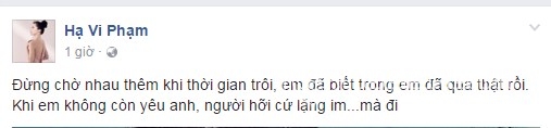 Mới đây, Hạ Vi chia sẻ: "Đừng chờ nhau thêm khi thời gian trôi, em đã biết trong em đã qua thật rồi. Khi em không còn yêu anh, người hỡi cứ lặng im...mà đi".