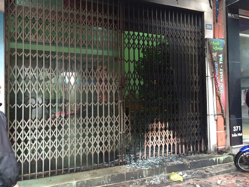 Tại hiện trường, đám cháy đã làm hỏng biển quảng cáo và bạt mái che, cửa thủy lực bị vỡ hoàn toàn, cửa xếp bằng sắt bị cháy đen, cong vênh.