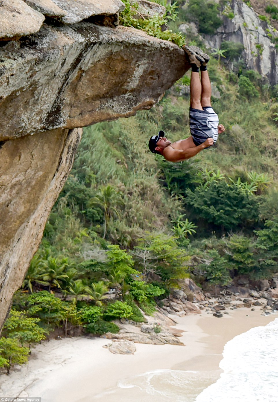 Một chàng trại tại Brazil đã khiến không ít người thót tim khi chỉ dùng duy nhất hai bàn chân mình để treo người lên vách đá tại Pedra Da Tartaruga, Brazil.
