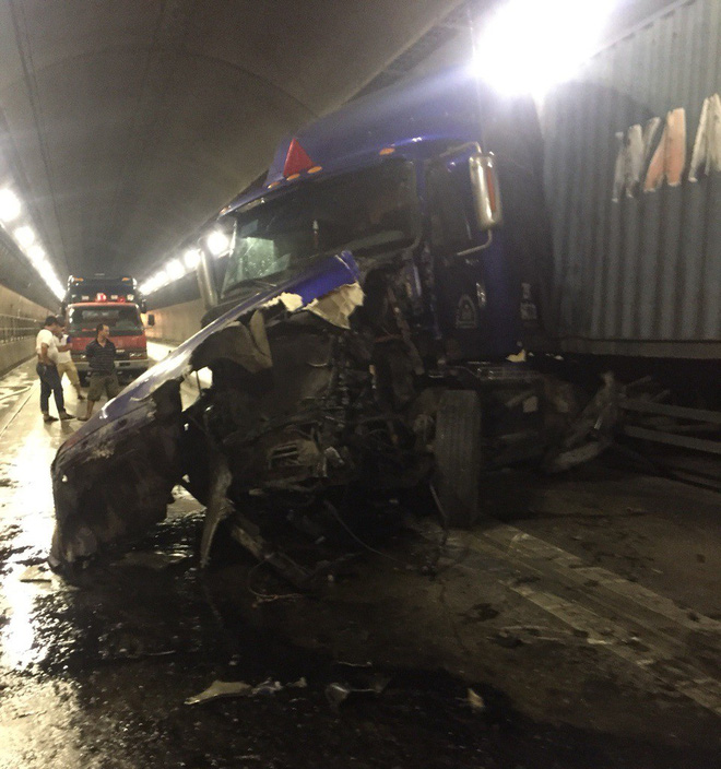 Chiếc xe đầu kéo đang lưu thông theo hướng Bắc – Nam đột ngột lao sang làn đường đối diện tông vào xe đi ngược chiều ngay trong hầm Hải Vân.