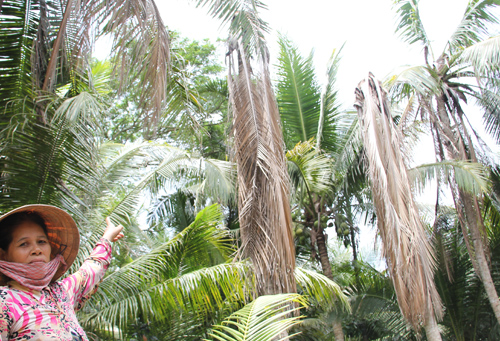 Hơn 200 cây dừa ở xã Tân Bình đã chết, nhiều cây khác đang trong tình trạng héo rũ |