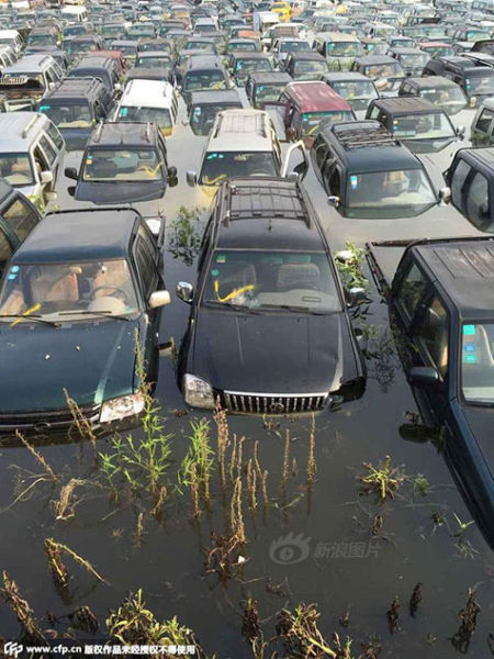 Tại Zhu Village, thành phố Yiwu, tỉnh Chiết Giang, hàng trăm chiếc ô tô đã biến thành phế liệu do bị ngâm nước mưa. |
