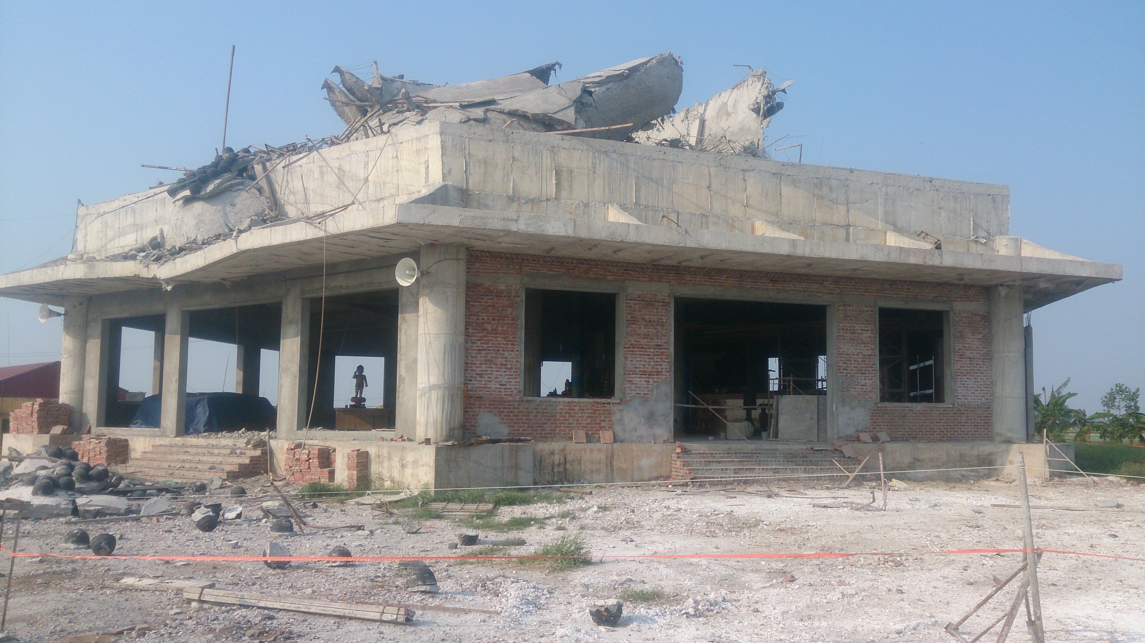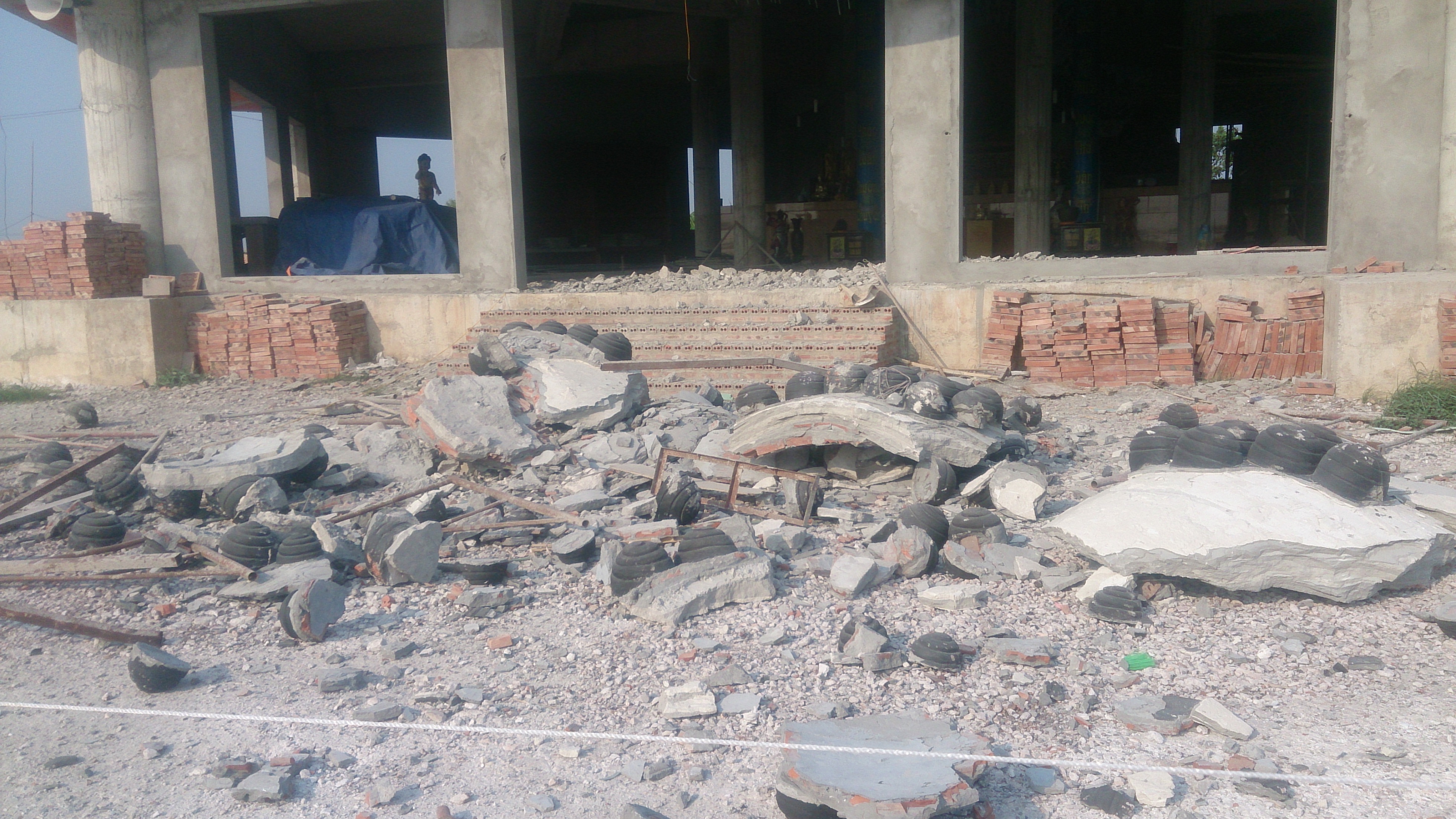 Bức tượng phật bị sụp đổ hoàn toàn trên mái của ngôi chùa |