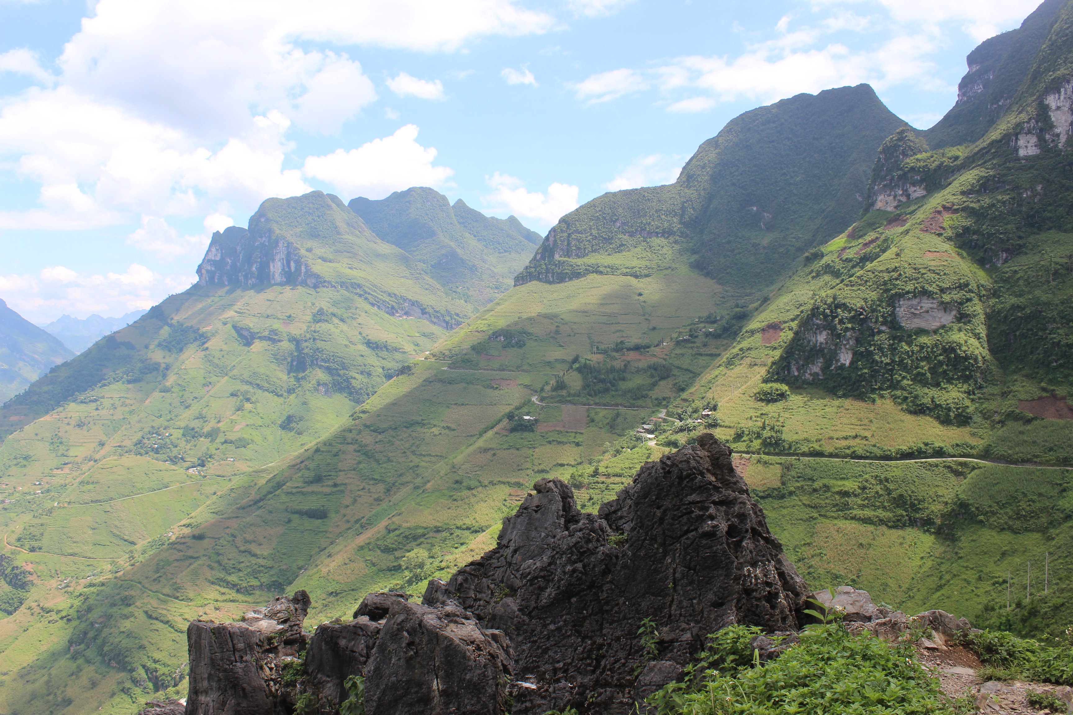 Tuy nhiên, đường đẹo quanh co uốn lượn theo vách núi sừng sững, bên dưới là dòng sông Nho Quế xanh thẳm tạo nên cảnh sắc không nơi nào sánh được.