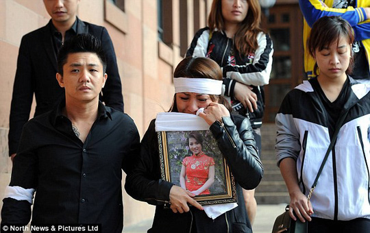 Người thân ôm di ảnh của nạn nhân Quyen Ngoc Nguyen bên ngoài Tòa án Newcastle ở Anh. Ảnh: Daily Mail |